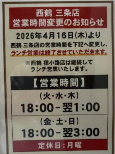 4月16日より、西鶴三条店はランチ営業を終了し、ディナー営業のみとさせていただきます。